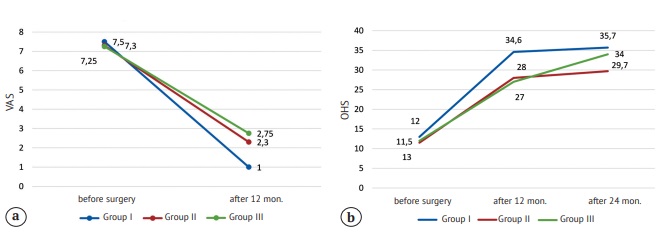Fig. 3. Preoperative and postoperative results assessment in the study groups: a — pain severity according to VAS; b — functional results according to OHS