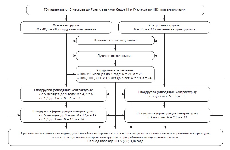 Проведено одноцентровое ретроспективное когортное контролируемое исследование результатов до- и послеоперационного обследования 70 детей в возрасте от 5 месяцев до 7 лет с вывихом бедра (86 ТБС) при амиоплазии, из них 42 (60%) мальчика и 28 (40%) девочек.