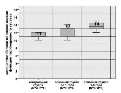 Рис. 2. Диаграмма размаха баллов по ШОФТБС у пациентов первых подгрупп после хирургического лечения (р≤0,05, U-критерий Манна – Уитни), где N — количество пациентов, n — количество тазобедренных суставов / Fig. 2. Distribution of the values according to the hip functional scale in subgroup 1 after surgical treatment (p = 0.05, Mann–Whitney U-test); N — number of patients; n — number of hips