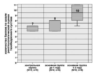 Рис. 6. Диаграмма размаха баллов по ШРОТБС у пациентов вторых подгрупп после хирургического лечения (р≤0,05; U-критерий Манна – Уитни) / Fig. 6. Distribution of the values according to the hip X-ray assessment scale in subgroup 2 after surgical treatment (р≤0.05, Mann–Whitney U-test)
