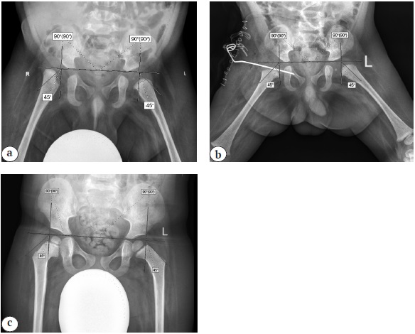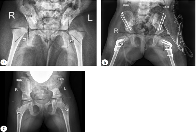 Рис. 4. Рентгенограммы таза в прямой проекции пациентки 2 лет из первой подгруппы: a — до операции; b — интраоперационная рентгенограмма после ОВБ, КОБ, ПОС; c — через 2 года после операции / Fig. 4. X-ray of the hip joints in the A–P view in a 2-year-old patient from subgroup 1: a — before surgery; b — intraoperative X-ray after hip open reduction, femoral osteotomy, and Salter innominate osteotomy; c — 2 years after surgery
