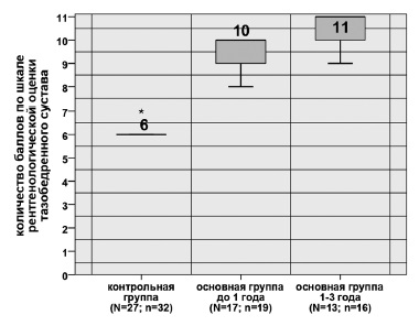 Рис. 3. Диаграмма размаха баллов по ШРОТБС у пациентов первых подгрупп после хирургического лечения (р≤0,05;U-критерий Манна – Уитни) / Fig. 3. Distribution of the values according to the hip X-ray assessment scale in subgroup 1 after surgical treatment (p≤0.05, Mann–Whitney U-test)