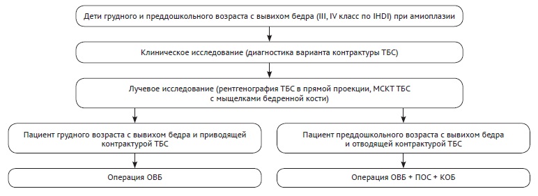 На основании проведенного сравнительного анализа эффективности оперативного лечения детей до 3 лет с вывихом бедра при амиоплазии предложен алгоритм выбора способа хирургического лечения. Первоочередным этапом выбора является правильная постановка диагноза, уточнение варианта контрактуры ТБС. Следующим этапом необходимо выполнить рентгенографию в прямой проекции и МСКТ ТБС с захватом мыщелков бедренной кости для определения рентгеноанатомических особенностей, характерных для пациентов с сопутствующими отводящими или приводящими контрактурами, которые необходимо учитывать в ходе предоперационного планирования. Данный алгоритм позволит с высокой степенью вероятности разделить пациентов на две группы, требующие дифференцированного подхода к лечению, даже если они уже его получили или находятся на этапе лечения по поводу контрактур коленных суставов и/или деформаций стоп. Таким образом, детям с отводящими контрактурами ТБС до полутора лет следует проводить лечение сопутствующих контрактур и деформаций суставов нижних конечностей и только потом выполнять вмешательства на ТБС в объеме ОВБ, КОБ, ПОС до 3 лет. Пациенты с приводящими контрактурами после рождения должны получать лечение, направленное на коррекцию сопутствующих контрактур и деформаций суставов нижних конечностей, а с 5 мес. до 1 года им необходимо выполнить ОВБ. В случае более позднего обращения за помощью выполнение ОВБ, КОБ, ПОС до 3 лет также допустимо (рис. 8).