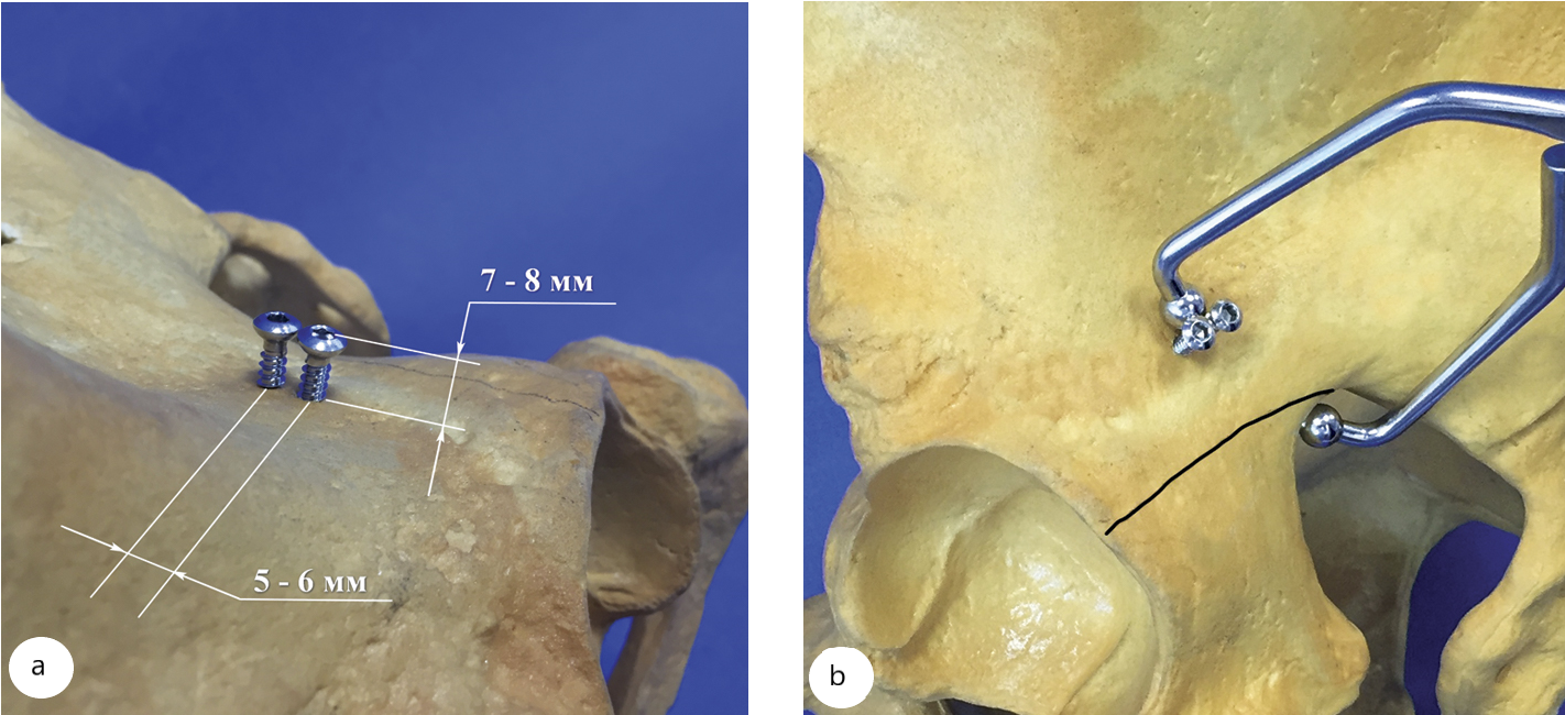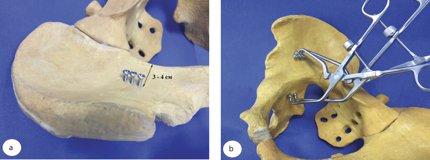 4. Fig. 3. Position of the Matta forceps branch in case of the acetabulum fracture on a plastic model of the pelvis:a — view of the support screws for reduction with two Matta forceps:b — the position of the Matta forceps branches during the reduction of the acetabulum quadrilateral plate fracture