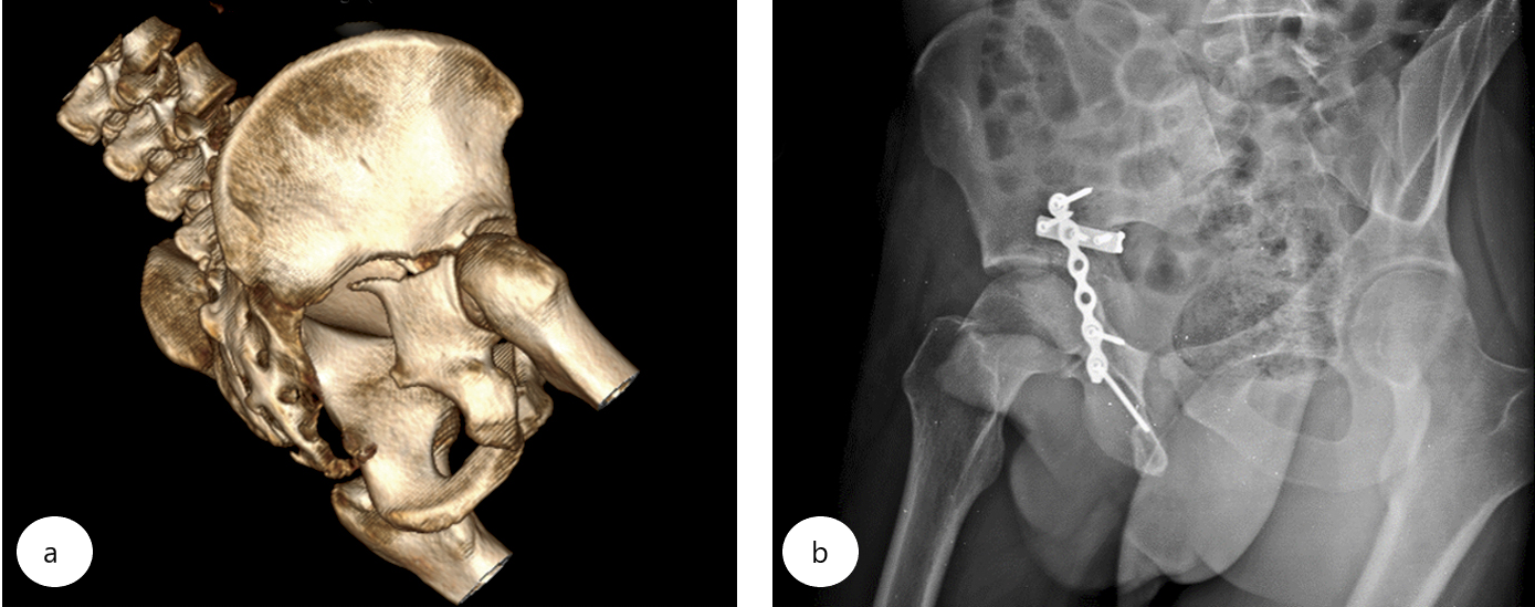 Fig. 4. Two–column fracture of the right acetabulum (AO/OTA 62C1e): a — CT 3D–reconstruction of the pelvis in inlet view; b — postoperative X-ray of the pelvis in the AP view