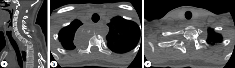 Fig. 1. CT images at the time of hospital admission: a — sagittal view: Th1-2 destruction, angular cervico-thoracic kyphosis 56° Cobb; b, c — axial view: paravertebral cyst, mainly located in the right paravertebral side, postlaminectomy defect С7-Th4