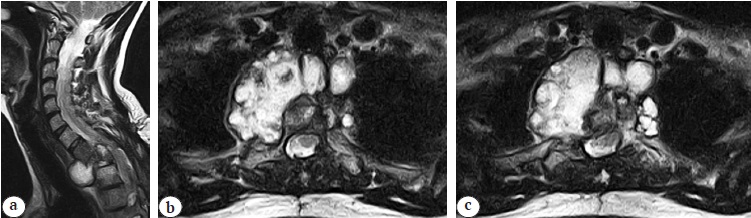 Fig. 2. MRI images at the time of hospital admission: a — sagittal view: paravertebral and epidural cystic components, compression myelopathy Th1-3 level; b, c — axial view: polycystic component with heterogeneous structure