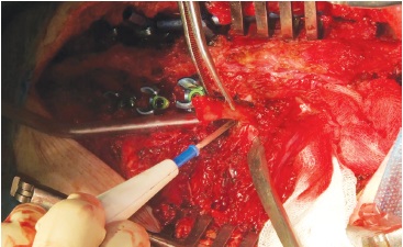 The anterior-lateral surface of the C7-Th2 vertebrae was extrapleurally skeletonized with cyst capsule access. The surrounding tissues are delimited with napkins that are moistened with 2% formalin solution. A foramen was made in the cyst wall, through which the hydatid fluid and protoscoleces were evacuated using an aspirator (Fig. 4).