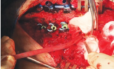 Stage 1 was the posterior instrumentation, where the screws were installed in the lateral masses of the C5, C6 vertebrae, C7 bodies, and Th3-5 transpedicular. Right-sided costotransversectomy of the ribs 1–3 was performed with the support of a nail installed on the left side (Fig. 3).