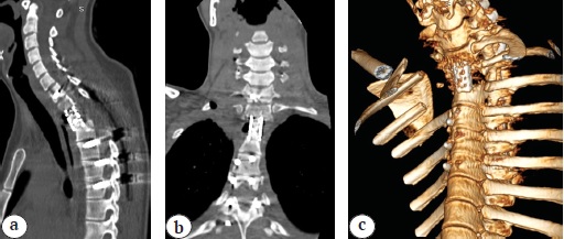 Fig. 3. Right side costotransverseectomy of 1–3rd ribs: a — postlaminectomy scar C7-Th4; b — left-side posterior instrumentation completed; c — vertertebral-end third rib resection
