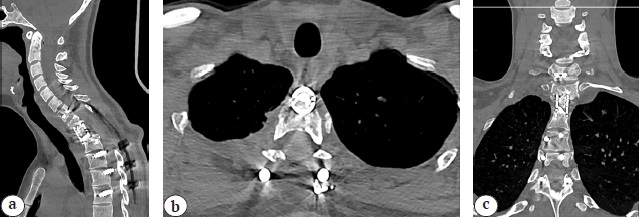 Fig. 6. CT images 12 month post-op: no signs of hydatid disease recurrence, anterior fusion formation Th1-3 with sagittal cervico-thoracic balance correction: a — sagittal view; b — axial view; c — frontal view