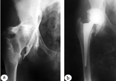 Fig. 1. X-rays of the right hip joint: a — before the first total hip arthroplasty; b — after surgery