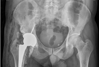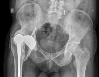 The patient was discharged from the clinic without complications, but within 10 days after the intervention, when sitting down on a bench, he noted a painful displacement in the joint area, which led to the impaired support ability of the extremity. The patient did not seek medical help and continued to walk with elbow crutches. Later, in a scheduled follow-up, he visited a traumatologist-orthopedist at the primary healthcare facility where a long-standing dislocation of the endoprosthesis head was detected, and revision arthroplasty was recommended.