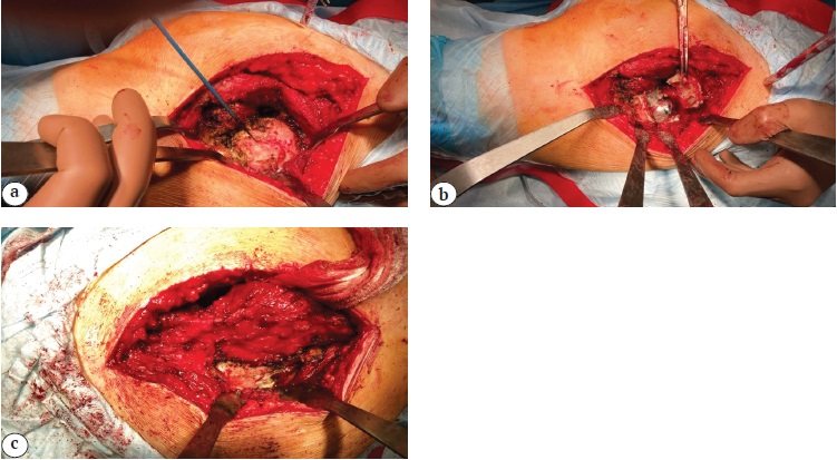 Fig. 3. Stages of the surgery: a — dissection of ossifications around the head of the endoprosthesis; b — removal of ossifications around the dislocated head of the endoprosthesis; c — visualization of ossifications