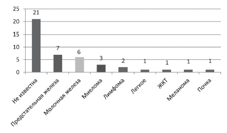 Fig. 2. Distribution of patients with metastatic vertebral fractures by types of primary tumors (localization) at the time of emergency admission