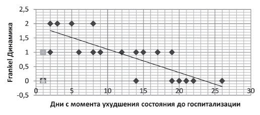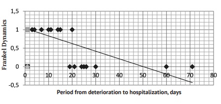 from the moment of deterioration to hospitalization group 1 (n = 20) group 2 (n = 18) | 22.5 (14.25; 40.0) 14.5 (6.25; 30.0) | (2; 80) (3; 45) | 0.048 |