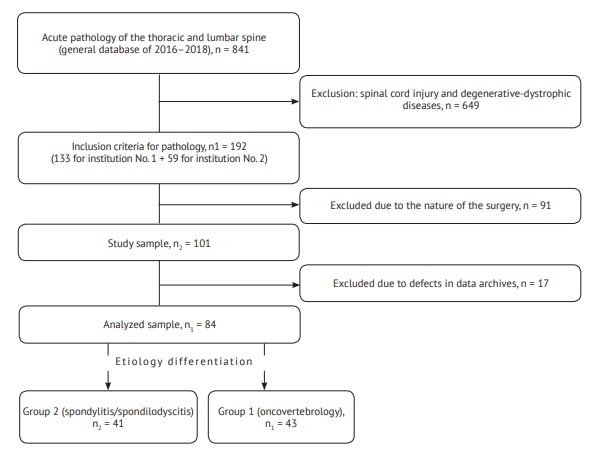 When forming the analyzed sample, 649 patients were excluded from the general database based on the nature of the disease, 91 patients due to the nature of the surgical intervention (non-decompressive-stabilizing surgeries), and 17 patients due to unsuitable medical documentation or archive of X-ray data for analysis. Thus, the final analyzed sample was retrospectively formed, including 84 patients who, in presence of tumor (group 1, n = 43) or infectious (group 2, n = 41) lesions of the vertebrae, underwent decompressive-stabilizing surgeries for emergency indications.
