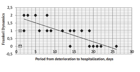 The types of the Frankel scale were assigned numerical values (points) (A was 1, B was 2, C was 3, D was 4, and E was 5) in statistical analysis, and changes in the indicator were assessed at 3 and 12 months after the surgery, both in comparison with the baseline and among themselves. A multiple regression model was used to test the results (dependent variable was Frankel dynamics; and the independent variable was days from the moment of hospitalization to surgery, days from the moment of deterioration to hospitalization) using the logarithmic transformation function of independent variables SPSS (Ln). Given the two independent analyzed variables, the backward stepwise method was chosen. The data of the standard β-coefficient of the regression model with the construction of scatterplots is presented to determine the strength and type of relationship. Changes were considered statistically significant at p < 0.05.