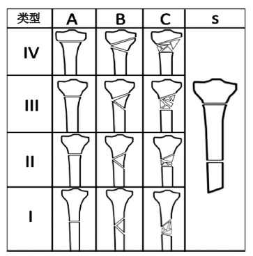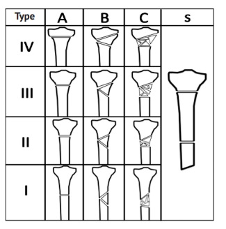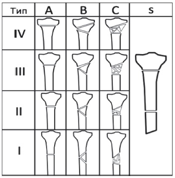 Fig. 1. PFL-TN Classification: I–IV — types; A–C — subtypes; s — segmental fracture