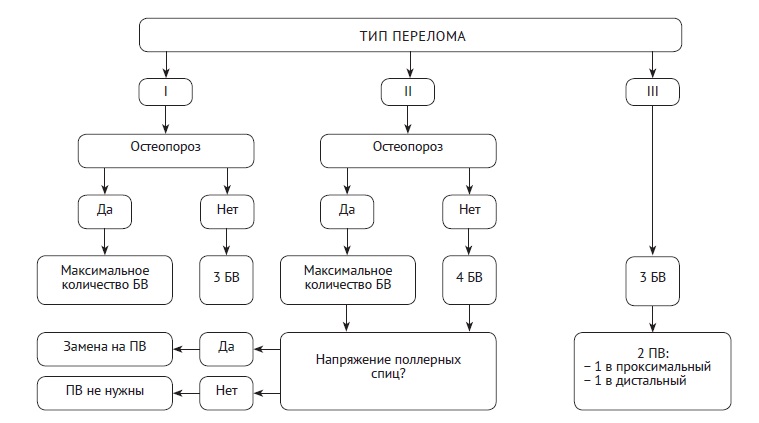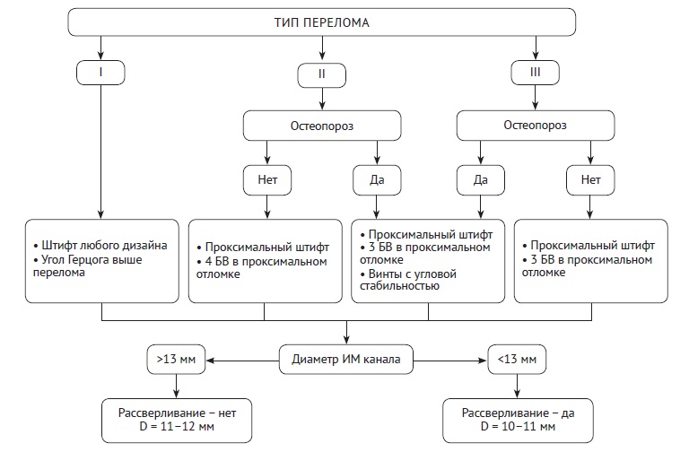 Fig. 3. The algorithm for choosing the method of proximal nail locking depending on PFL-TN fracture type