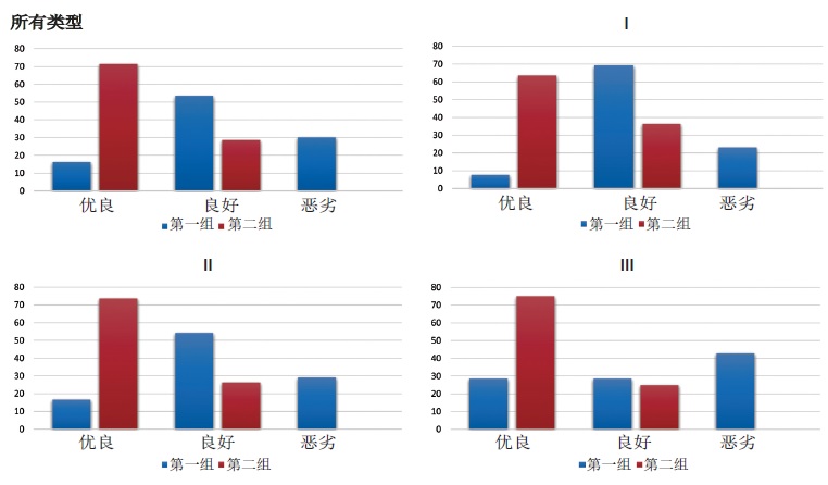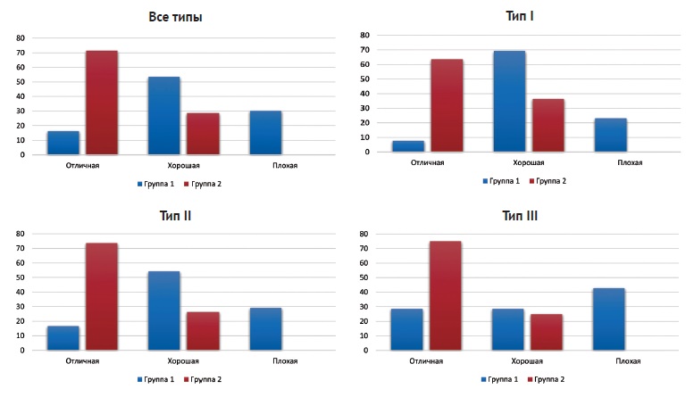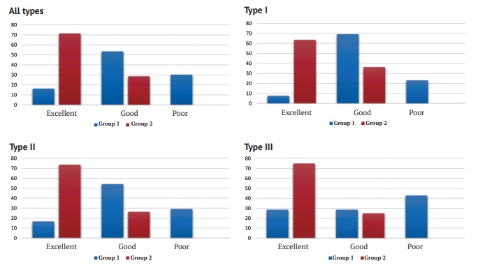 Fig. 4. Comparison of reduction quality between groups 1 and 2 in different fracture types