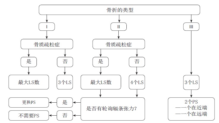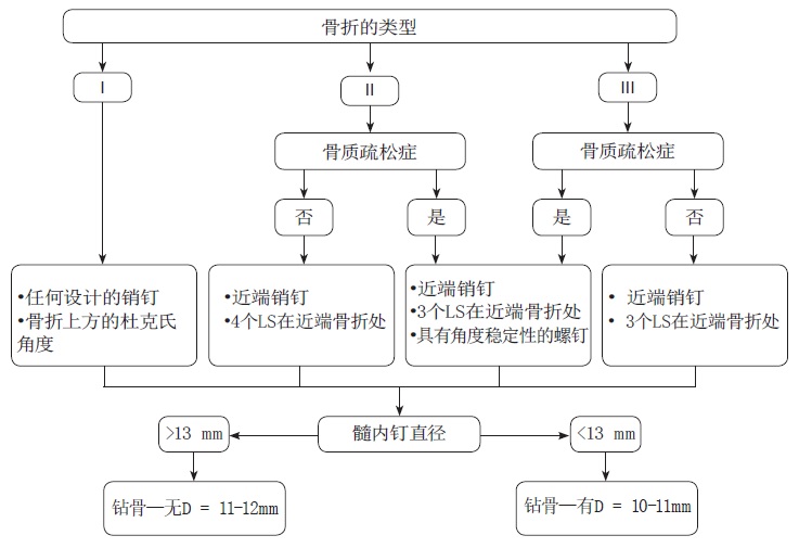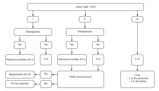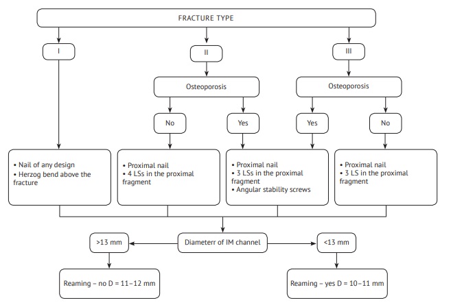 For intramedullary nailing, an algorithm was used to choose the most appropriate intramedullary fixator and its diameter, as well as proximal locking options depending on the type of fracture according to PFL-TN and bone quality (Fig. 2).