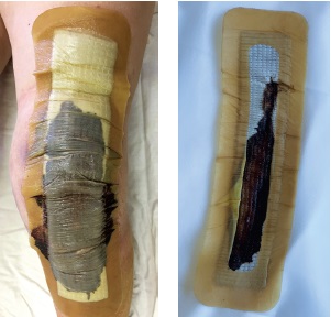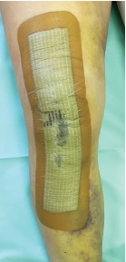 Fig. 3. View of the knee after total knee arthroplasty with Aquacel Ag Surgical dressing with leakage more than 50%