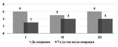 A well-known complication of the use of adhesive dressings is the development of epidermal blisters around the wound, referred to as blistering. In the early postoperative period, we managed to establish that the blistering phenomena occurred more often in group III, whose wounds were covered with classic adhesive bandages Curapor (n = 11). This finding was not only clinically obvious, but also had a significant justification. In group I, the described type of complications was detected only in one case (2%).