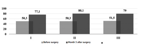Moreover, analysis was conducted to determine a possible statistical relationship between the parameters of the knee joint function on the KSS scale before surgery and 3 months after surgery. With identical baseline indicators in the immediate postoperative period, slight differences were found in the absolute numerical values in all groups; however, no significant differences were observed (p > 0.05). In group I at month 3, the average value on the KSS scale was 77.1 (Me 75.0 ± 1.5), and it was the lowest among the comparison groups. In groups II and III, values were almost comparable, with 80.1 (Me 77.0 ± 2.5) and 79.0 (Me 77.0 ± 2.7), respectively (Fig. 6).