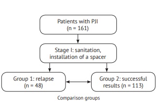 A retrospective single-center cohort study was conducted based on the medical records of 161 patients with PJI after primary knee replacement who underwent staged treatment from January 2007 to January 2017, collected during the thesis research of the first author* [*P M. Preobrazhensky, Ways to Optimize Revision Knee Arthroplasty in Patients with Periprosthetic Infection, Ph.D. (Medicine) thesis work, Saint Petersburg (2017)]. The average follow-up period was 5.6 (2.4–7.2) years.