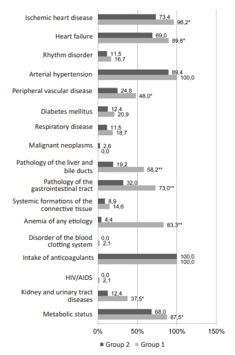 Fig. 2. Occurrence of concomitant pathology in groups 1 and 2; *p<0.001; ** p<0.0001 compared with group 2