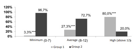 Fig. 3. Distribution of patients in groups 1 and 2 depending on the risk calculated by the comorbidity index, *** p<0.0001 compared with group 2