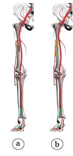 Рис. 6. Анатомические варианты строения переднего большеберцового сосудистого пучка: а — отсутствие передней бедренной артерии; b — отсутствие артерии тыла стопы / Fig. 6. Anatomical variants of the anterior tibial vascular bundle: a — the absence of the anterior tibial artery; b — the absence of the dorsalis pedis artery