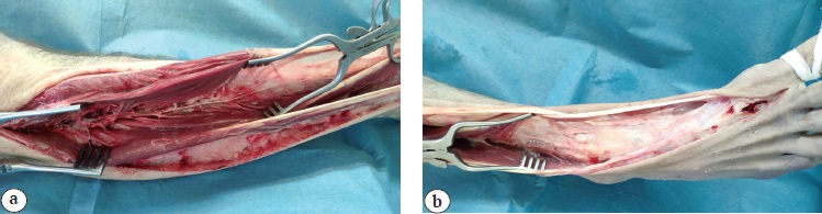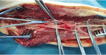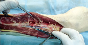 После осуществления всех измерений производили хирургический доступ к ПББСП. Послойно рассекали кожу, подкожную жировую клетчатку, фасцию голени. Затем, начиная от проксимальной трети голени, тупо в промежутке между передней большеберцовой мышцей и длинным разгибателем пальцев выделяли ПББСП и его ветви. Ветви, идущие к мышечным тканям, лигировали. Ветви, идущие к надкостнице дистального отдела большеберцовой кости, только выделяли.