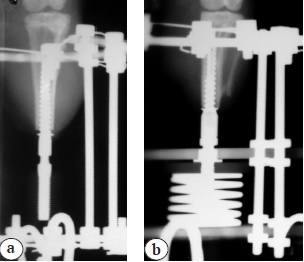 Fig. 1. Postoperative X-rays. Tibial implant: a — without compression device (group 1); b — with compression device