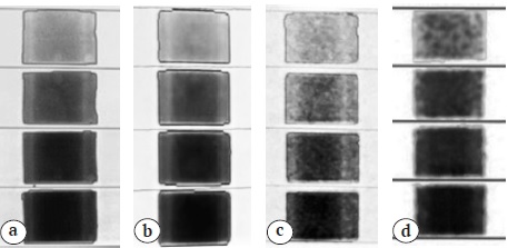 Fig. 2. The images were obtained from a PHK phantom w/o fat using the following DXA scanners: a — DXA-1; b — DXA-2; c — DXA-3; d — DXA-4