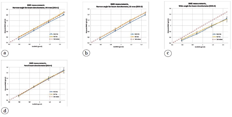Considering that the measured BMD, BMC, and the area values are linearly dependent from the set values, to compare the measurements from different DXA scanners we analyzed the corresponding linear approximation parameters. The comparison was performed using the generalized linear model (GLM) method for w/ and w/o fat conditions. A significance level was set to <0.05.
