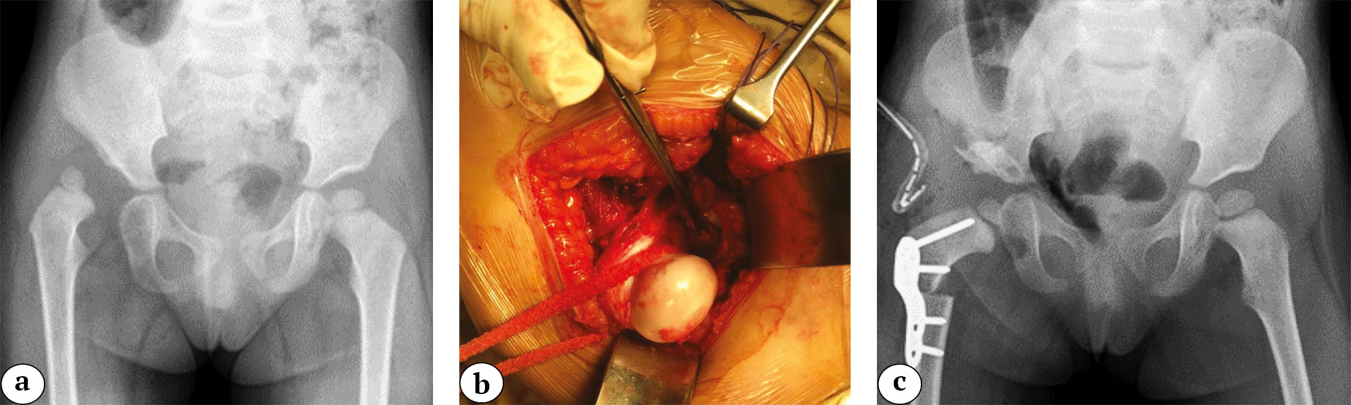 Рис. 1. Хирургическое вмешательство: a — рентгенограмма до операции: визуализируется вывих правого тазобедренного сустава (IV степень дисплазии по классификации IHDI); b — хирургический доступ; c — рентгенограмма после операции: вывих правого тазобедренного сустава устранен, выполнена варизирующая остеотомия бедренной кости, фиксация 2,7 мм LCP пластиной и ацетабулопластика по Dega