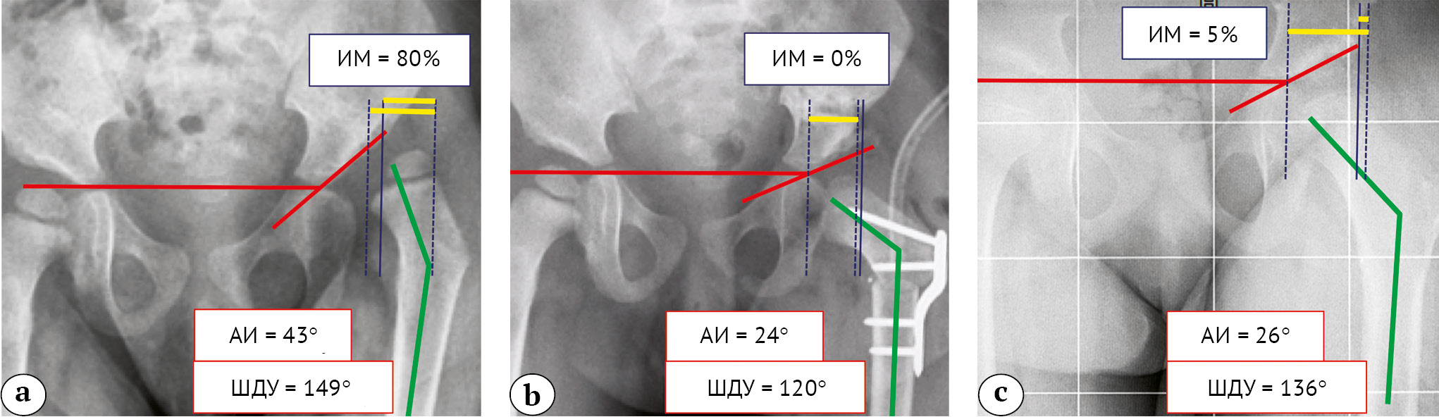 Рис. 2. Рентгенометрические параметры таза пациента 2 лет 1 мес.: а — до операции; b — после операции; с — на последнем осмотре