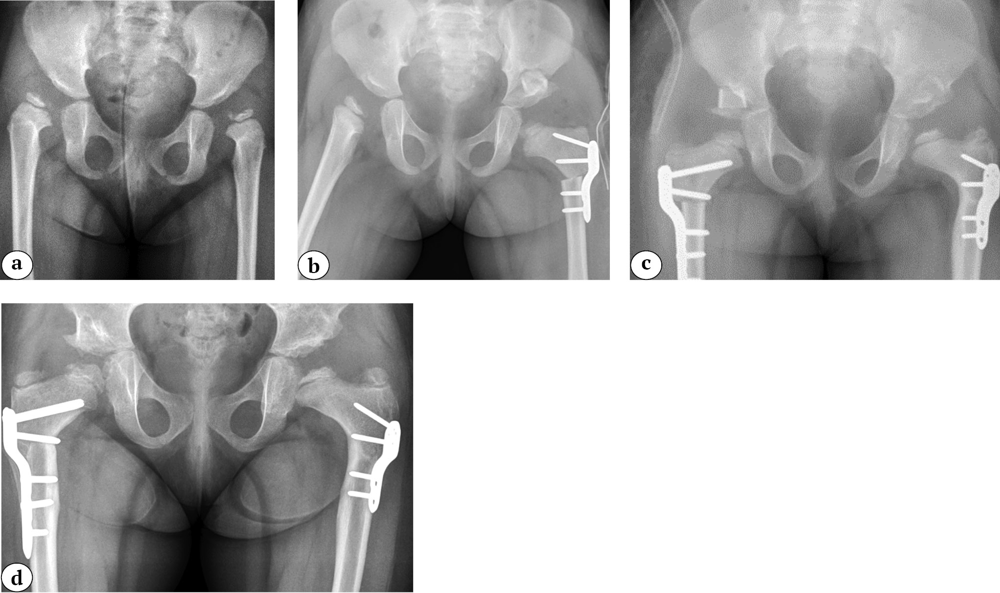 Fig. 3. X-rays of the patient aged 2 years and 5 months. Before the first operation: bilateral dislocation of the hip (Grade III dysplasia according to IHDI classification) (a); after the first operation: dislocation of the left hip is corrected, varus osteotomy of the femur is performed, fixation with a 2.7 mm LCP plate, and acetabuloplasty according to the Dega technique (b); 10 months after the second operation: dislocation of the right hip is corrected, varus osteotomy of the femur is performed, fixation with a 3.5 mm LCP plate, and acetabuloplasty according to the Dega technique (c); development of avascular necrosis bilaterally 2 years and 5 months after the first operation (d)