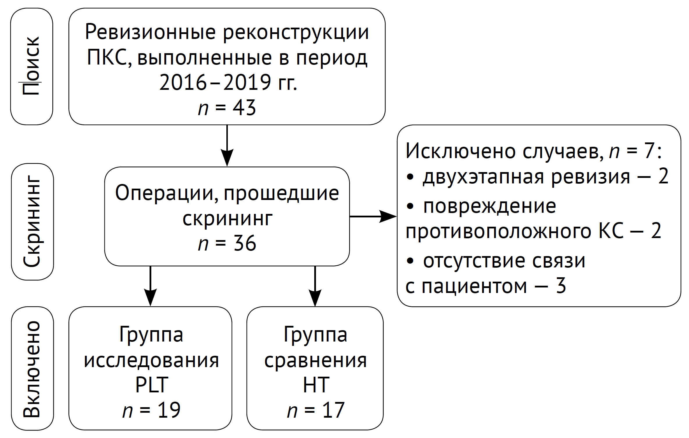 This is a retrospective cohort comparative single-center non-randomized study. A retrospective analysis of medical records of 43 patients who underwent revision ACL reconstruction at Novosibirsk Research Institute of Traumatology and Orthopedics n.a. Ya.L. Tsivyan in the period from 2016 to 2019 was performed.