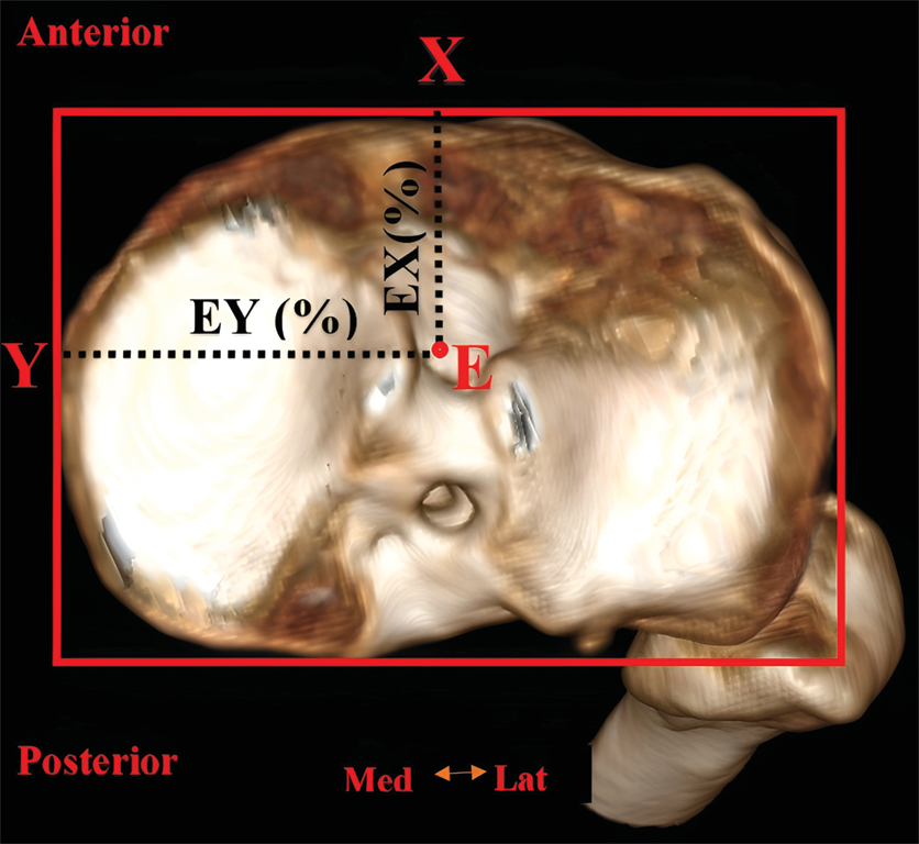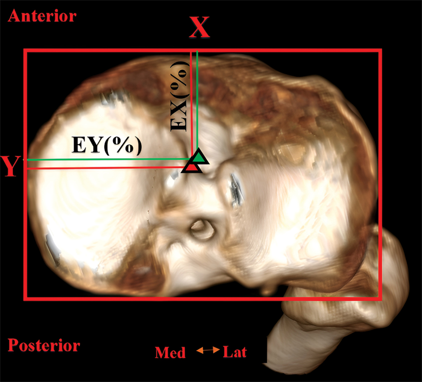 Henceforward: EX (%) — distance from the anterior edge of the tibial plateau in percentage; EY (%) — distance from the medial edge of the tibial plateau in percentage; Gh (%) — distance from the deepest point of the medial margin of the lateral femoral condyle in percentage; Gt (%) — distance from the Blumensaat’s line in percentage.