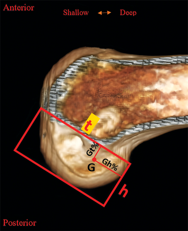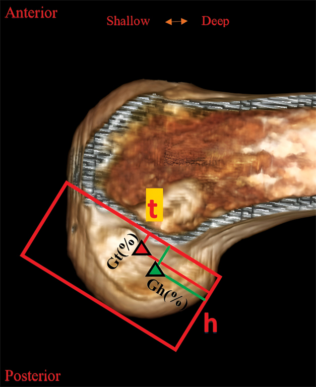 h — line passing through the extreme point of the posterior edge of the lateral femoral condyle, perpendicular to the line t; Gh (%) — distance from the deepest point of the medial edge of the lateral femoral condyle (29.9%); Gt (%) — distance from the Blumensaat’s line (30.1%)