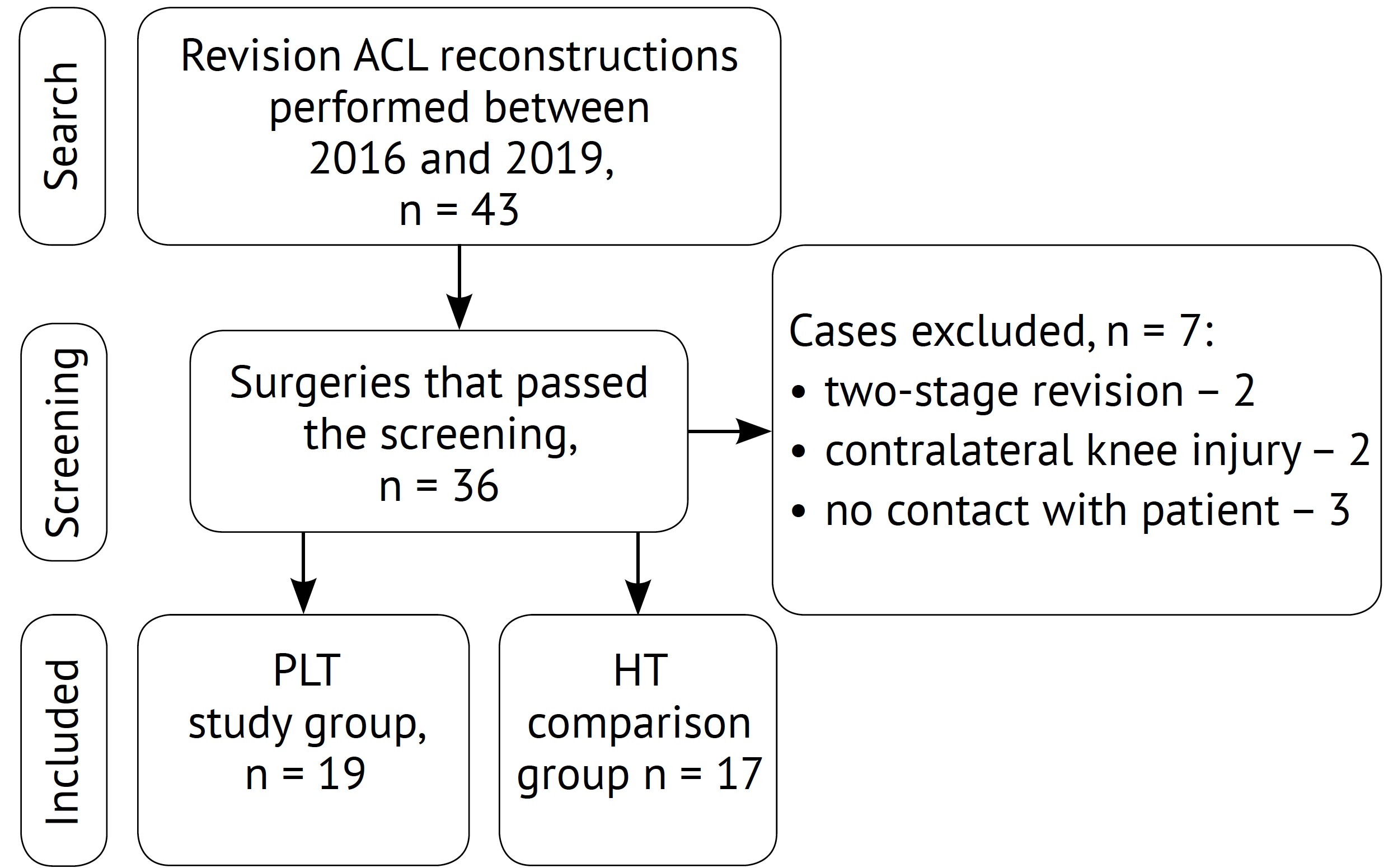 Taking into account the inclusion, non-inclusion, and exclusion criteria, we analyzed 36 completed cases (Fig. 1). Patients were divided into two groups according to the type of tendon autograft used: patients in the PLT study group (n = 19) — a peroneus longus tendon (PLT) autograft was used, while in the HT comparison group (n = 17) — a hamstring tendon (HT) graft was used.