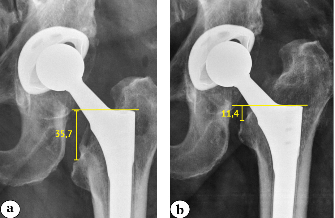 Fig. 1. X-ray images of the left hip of a 64-year-old patient after revision surgery: a — on day 1; b — in 9 months: 24.3 mm subsidence of the stem is observed