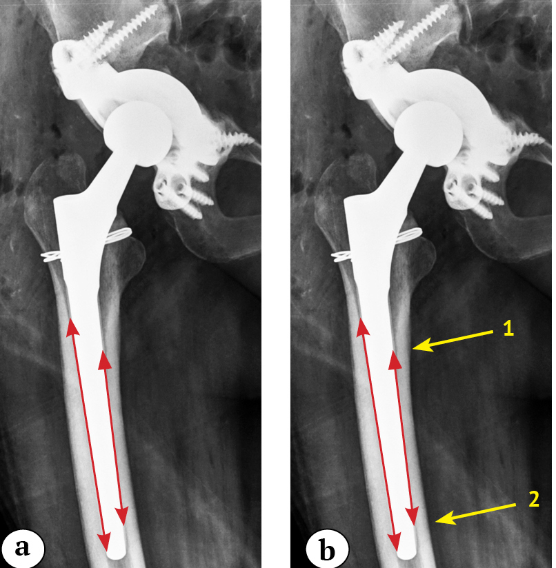Fig. 2. X-ray images of the right hip of a 50-year-old patient on day 1 after revision surgery: a — the lines indicate the contact between the femoral component and the cortical layer of the femur on the medial and lateral sides; b — the length of the bicortical contact was defined as the total length of the direct contact between the cortical plate and the contour of the prosthesis without a radiolucent line (arrows 1 and 2)