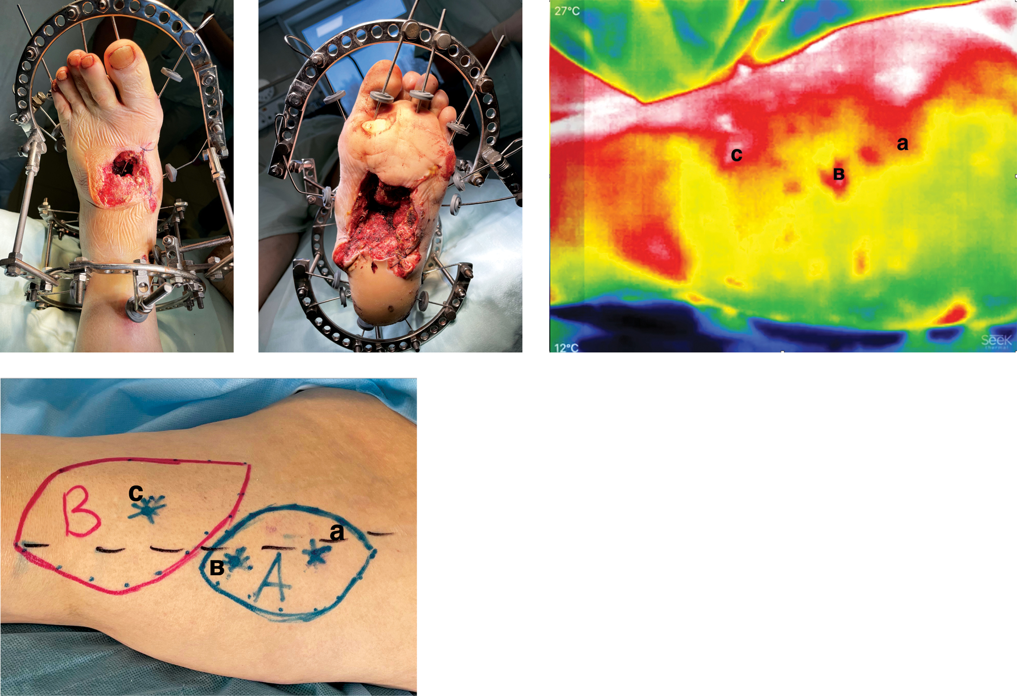 Рис. 1. Фото стопы после огнестрельного ранения с дефектом тканей (а, b); донорская зона лоскута ALT по переднелатеральной поверхности бедра (c, d): А — лоскут ALT; B — лоскут free-style; «а», «в» и «с» — выявленные при помощи ДИТ и подтвержденные звуковой доплерографией перфорантные сосуды