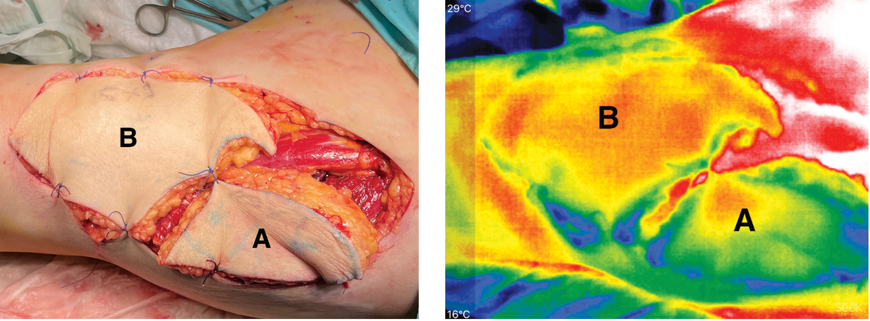 Рис. 2. Фото и термограмма лоскутов после диссекции до отсечения питающих ножек: А — лоскут ALT; В — лоскут free-style