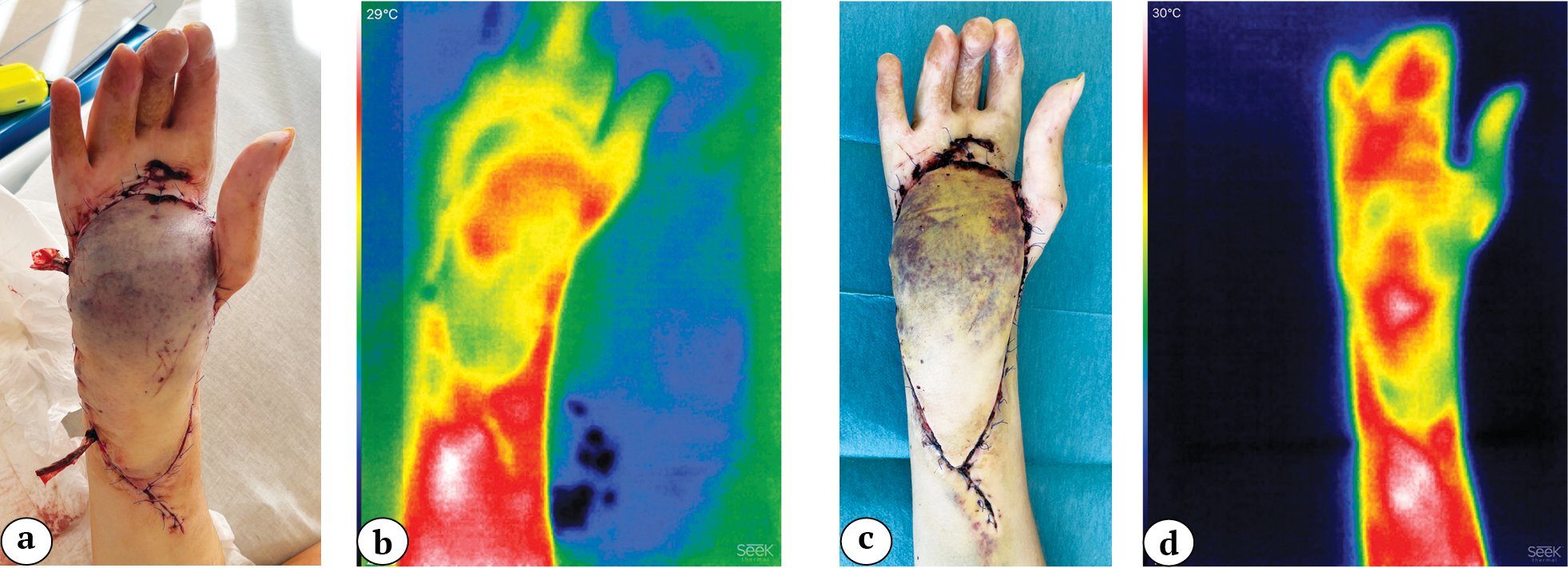 Fig. 5. General view and thermography of the flaps in the postoperative period: a, b — hand view and flap thermogram 3 days postoperatively; c, d — hand view and flap thermogram 10 days after surgery, before discharge
