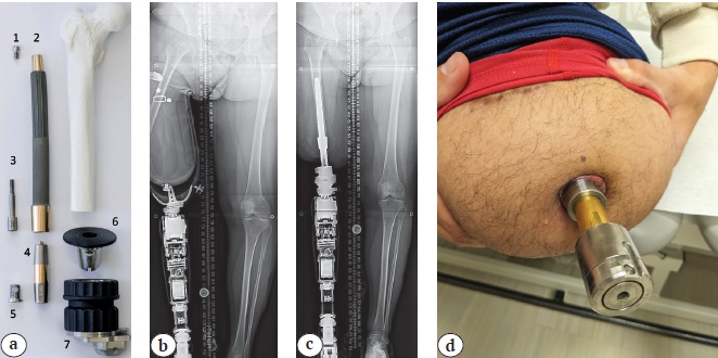 c — long-standing X-ray of the same patient after transfemoral osseointegration, showing the anatomic alignment of the leg;